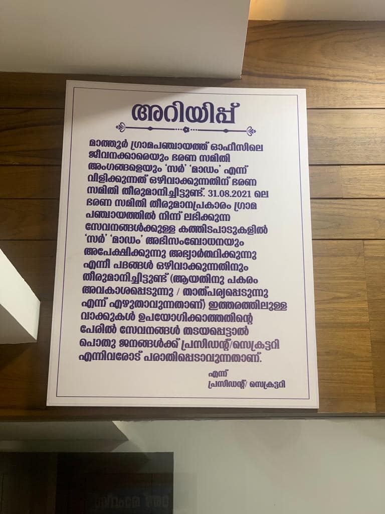 మేం కూర్చున్న గది ఆధునికంగా ఉంది. ఆ మాటే అంటే ఇది క్రొత్తగా నిర్మించింది అని, నిన్ననే పాల్ఘాట్ MLA దీన్ని ప్రారంభించారని చెప్పారు. మిగతా ఆఫీస్ కూడా చూడండి అని లోనికి తీసుకువెళ్లారు. ఆఫీసు చాలా బాగుంది. ఒక నోటీసు చూపించి “ఇది దేశంలోనే మొట్టమొదటగా ఈ పంచాయితీ చేసిన తీర్మానం. సర్టిఫికెట్ కోసం వచ్చిన గ్రామస్తులెవ్వరూ ఈ ఆఫీసులో ఎవ్వరినీ సర్ అని గానీ మేడమ్ అని గానీ పిలవనవసరం లేదు. బ్రతిమిలాడుతున్నట్లుగా అప్లికేషన్లు రాయనక్కర లేదు” అని వివరించారు. ఈ విషయం నేను దినపత్రికలలో చదివాను గానీ అది ఈ ఊరిదని తెలియదు.