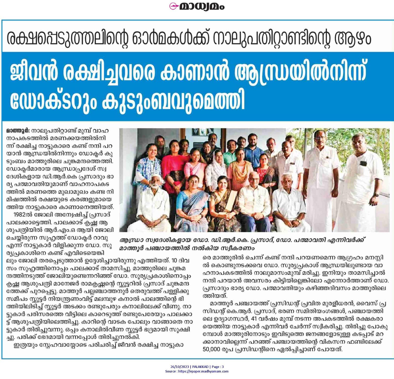 చచ్చిపోతాం అని తీర్మానించుకున్న నాకు బ్రతికి ఉండడం సంతోషాన్నిచ్చింది. చాలా ఫ్రాక్చర్లు అయి ఉంటాయనుకున్న నేను లేచి నిలబడి ప్రకాష్ దగ్గరకు వెళ్ళగలిగాను. అతని ముఖంలో బాధ కన్పిస్తోంది. లేవలేకపోతున్నాడు. మోకాలు నొప్పిగా ఉందని చెప్తున్నాడు. ఇంతలోనే బిలబిలమంటూ వచ్చేశారు చుట్టు ప్రక్కల ప్రజలు. ప్రకాష్ కాలు నొప్పిగా ఉందని మర్దనా చేయడం మొదలుపెట్టారు. అలా మర్దనా చేయకూడదని చెప్పడానికి నాకు మలయాళం రాదు వారికి తెలుగు రాదు. ఎలాగో అలాగు ఇతను డాక్టరు అని, పాల్ఘాట్ లోని డా. క్రిష్ణన్స్ హాస్పిటల్ లో పనిచేస్తున్నాడని చెప్పాను. వెంటనే ఆ మర్దనా ఆపేశారు. చెల్లా చెదురుగా పడిపోయిన నా ఒరిజినల్ సర్టిఫికేట్స్ అన్నింటిని ఏరి జాగ్రత్తగా నాకు అప్పగించారు. వెంటనే ఒక టాక్సీని తీసుకువచ్చి నలుగురు కారులో మమ్మల్ని ఎక్కించుకుని డా. క్రిష్ణన్స్ హాస్పిటల్ కు తీసుకెళ్లారు.