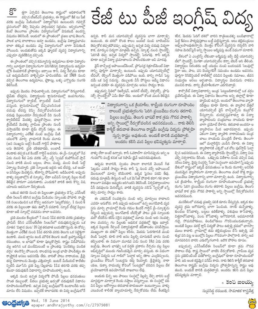 ది. 18-06-2014న కంచ ఐలయ్య గారు ఆంధ్రజ్యోతిలో రాసిన “కె.జి. టు పీజీ ఇంగ్లీషు విద్య” వ్యాసం