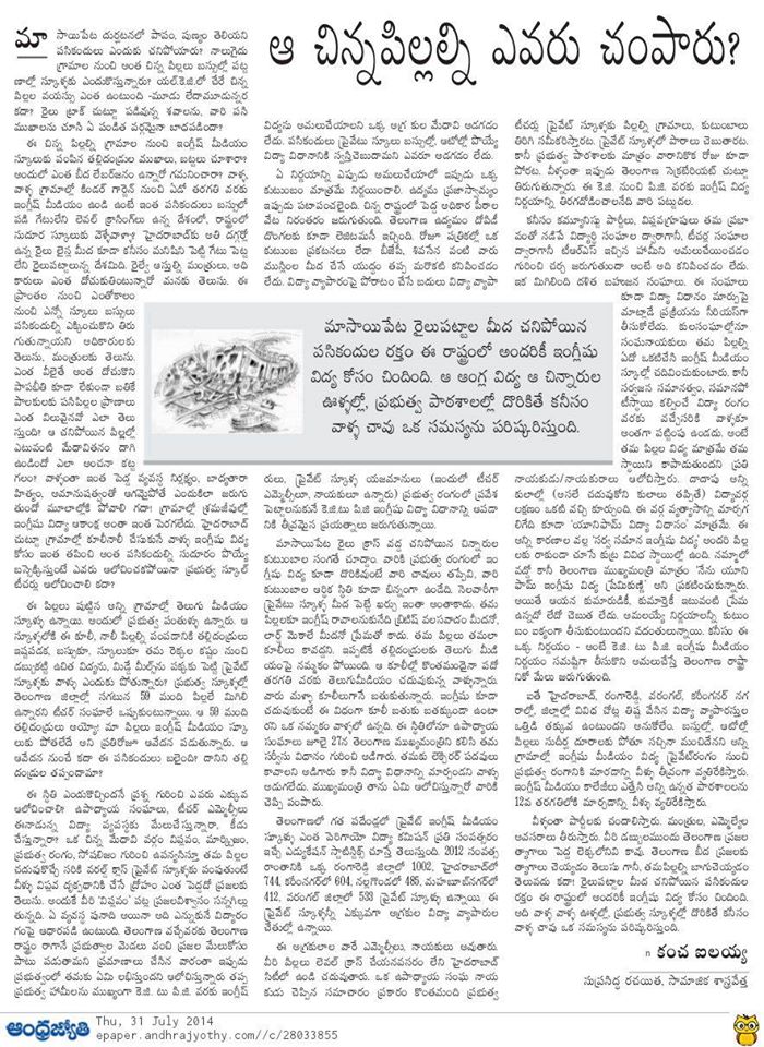 మరి, మన తెలుగు పిల్లలకే ఎందుకీ అవస్థ? మీలాంటి మేధావులు, సంస్థలు ఇంగ్లీషుపై పెంచుకొన్న మోజుకూ, దశాబ్దాలుగా చేస్తున్న ప్రచారానికీ జనం కండిషనైపోయారు. ఇంగ్లీషు నేర్చుకోవడానికీ, ఇంగ్లీషు మీడియంలో చదవడానికీ ఉన్న తేడా మీకు తెలియదని నమ్మమంటారా? ఇప్పుడు కావలసింది సొంత భాషలో శాస్త్రీయ విద్యను బోధించే పాఠశాలలే గాని, ఇంగ్లీషు మీడియం పాఠశాలలు కాదు. పిల్లలకు మూడవ తరగతి నుండి ఇంగ్లీషు భాషను బోధించడం మొదలుపెట్టి, పదో తరగతి నాటికి అందులో సాధికారికతను తేవచ్చు. ఇది శాస్త్రీయం. దీనికి భిన్నంగా లెక్కలు, సోషల్, సైన్సుల ద్వారా ఆంగ్లాన్ని నేర్చుకోమని ప్రచారం చేసేవాళ్ళంతా మూసాయిపేట చిన్నారుల దుర్మరణాలకు కారకులే! ఇలాంటి అశాస్త్రీయ వాదనలకు ప్రాచుర్యం కల్పించే పత్రికలూ కూడా ఈ విషాదానికి బాధ్యత వహించక తప్పదు.