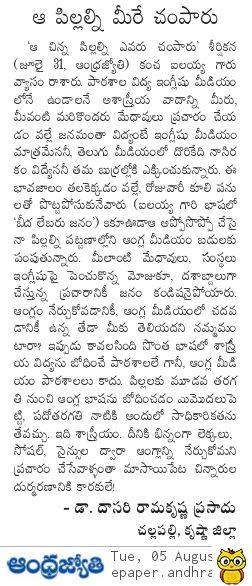 ప్రైవేటు పాఠశాలల్లో గాని, ప్రభుత్వ పాఠశాలల్లో గాని ఒకే విధమైన, నాణ్యమైన విద్యా విధానం ఉండాలనీ, తమ ఊర్లోనే పిల్లలు చదువుకోవాలనీ విద్యావేత్తలు ప్రచారం చేయాలి గాని, ప్రతి ఊళ్లోనూ ఇంగ్లీషు మీడియం పాఠశాల పెట్టాలని డిమాండ్ చేయడం అశాస్త్రీయం. అభివృద్ధి చెందిన ఏ దేశంలోని పిల్లలూ తమకర్ధం గాని పరభాషలో చదువుకోవడం లేదే! ముక్కుపచ్చ లారని బిడ్డలు ఇంతింత దూరాలు వెళ్లి చదువుకోవడం లేదే!